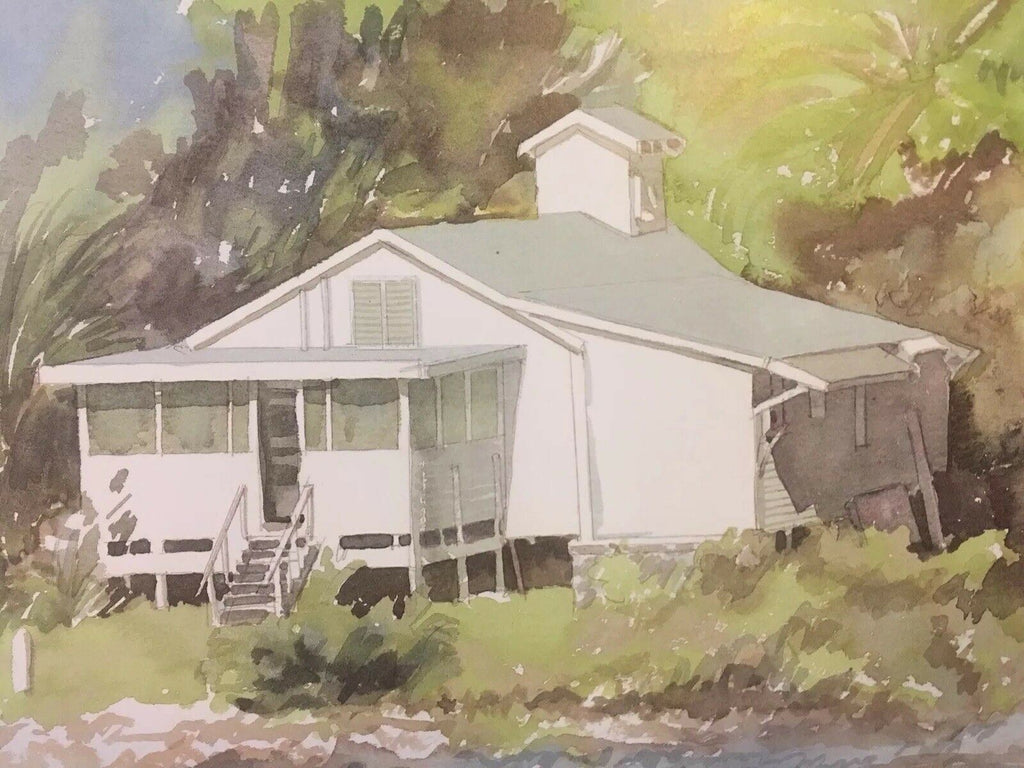 Beautiful art print depicting a guest cottage at Pigeon Key, the island just off the 7 Mile Bridge between Marathon, Florida and the Lower Keys. Cottage was damaged extensively in Irma but this print captures its former beauty. Tranquil, tropical cottage from days gone by sits just off the shoreline. Original was a watercolor. Print comes from Kennedy Gallery and Studios in Key West. It measures 12.5" tall by 19" across. New old stock (likely 1990's) print is unframed and mint. This comes from an elderly Key West dealer/collector.
